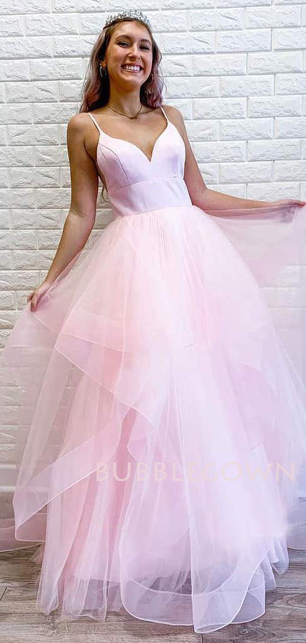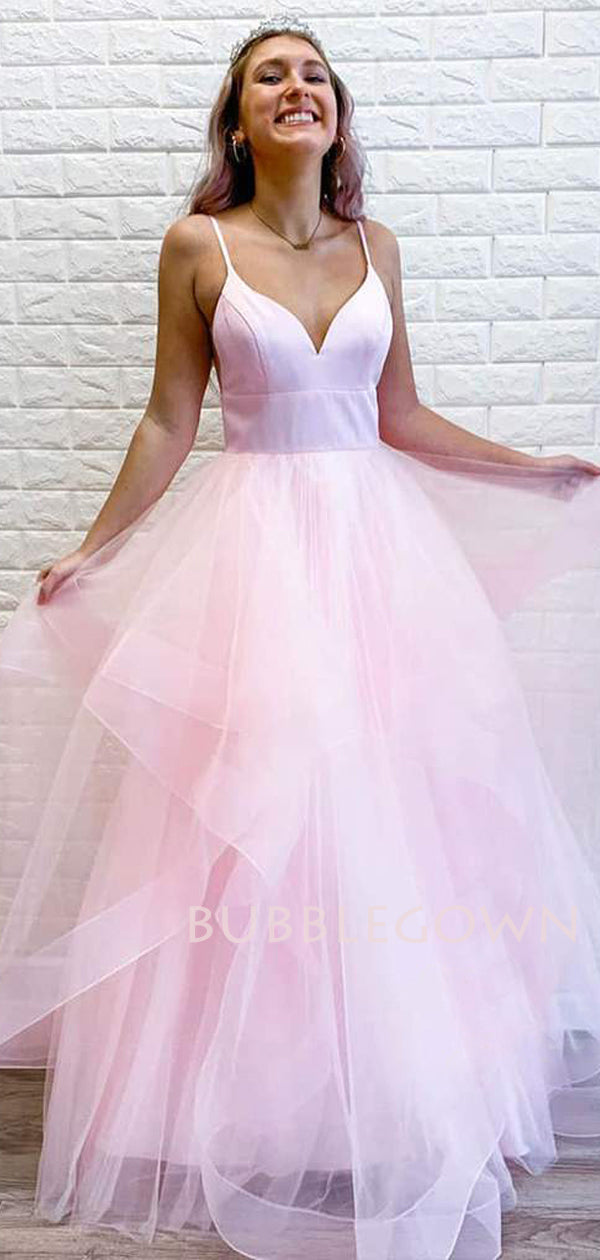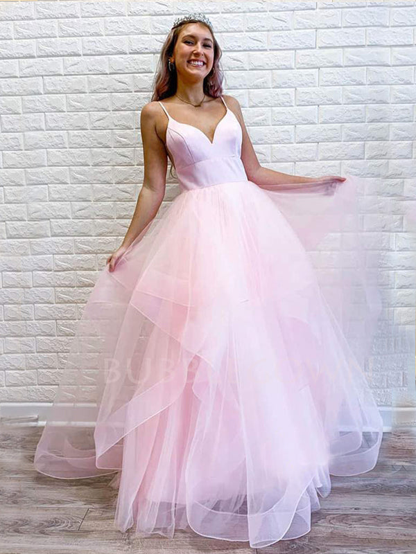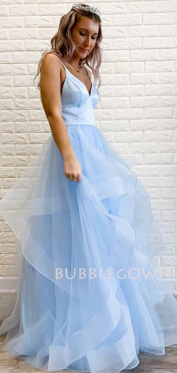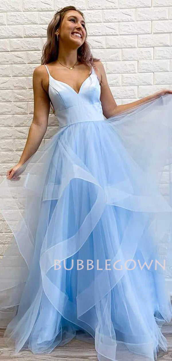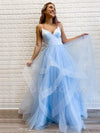 A-line Blue Tulle Spaghetti Straps Long V Neck Evening Prom Dresses, C