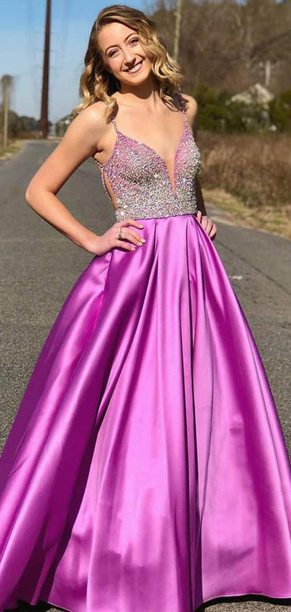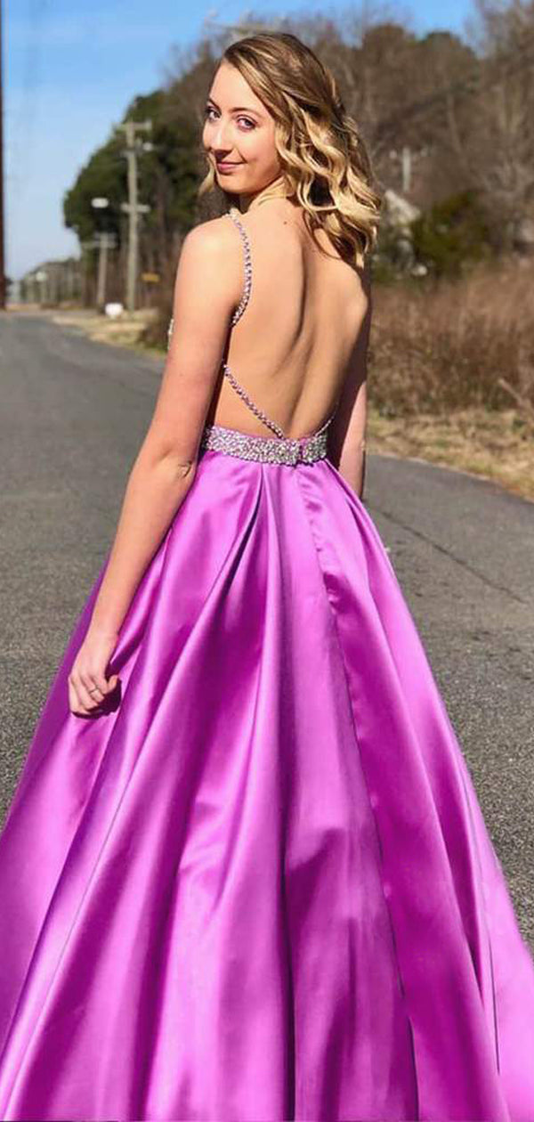 A-line Purple Satin Beaded Backless Long Evening Prom Dresses, Cheap C