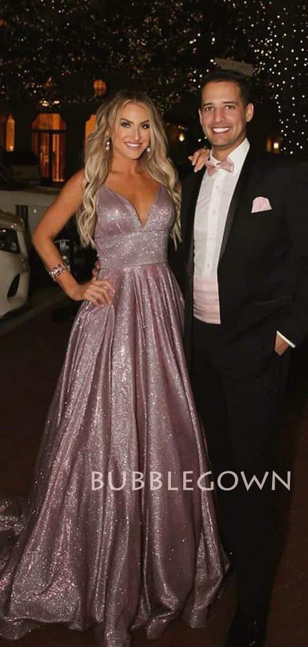 A-Line Sparkle Spaghetti Straps V Neck Backless Long Evening Prom Dresses, Cheap Custom Prom Dresses,MR7488