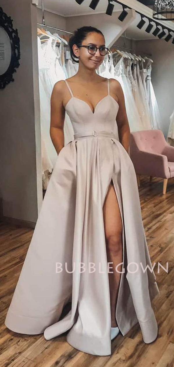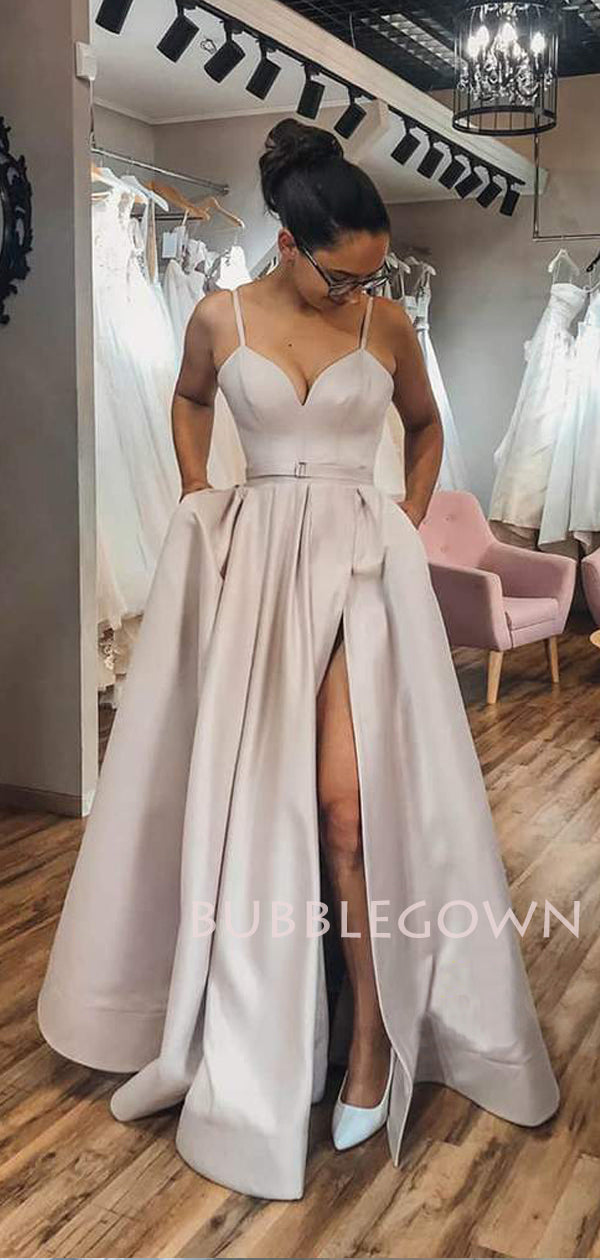 A-line V Neck Spaghetti Straps Satin Long Side Slit Evening Prom Dress