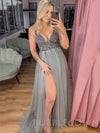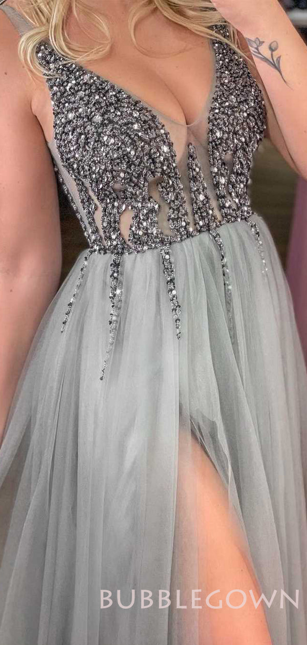 Grey Tulle See Through V-neck Beaded Long Evening Prom Dresses, Cheap Custom V-back Prom Dress, MR7805 Grey Tulle See Through V-neck Beaded Long Evening Prom Dresses, Cheap Custom V-back Prom Dress, MR7805