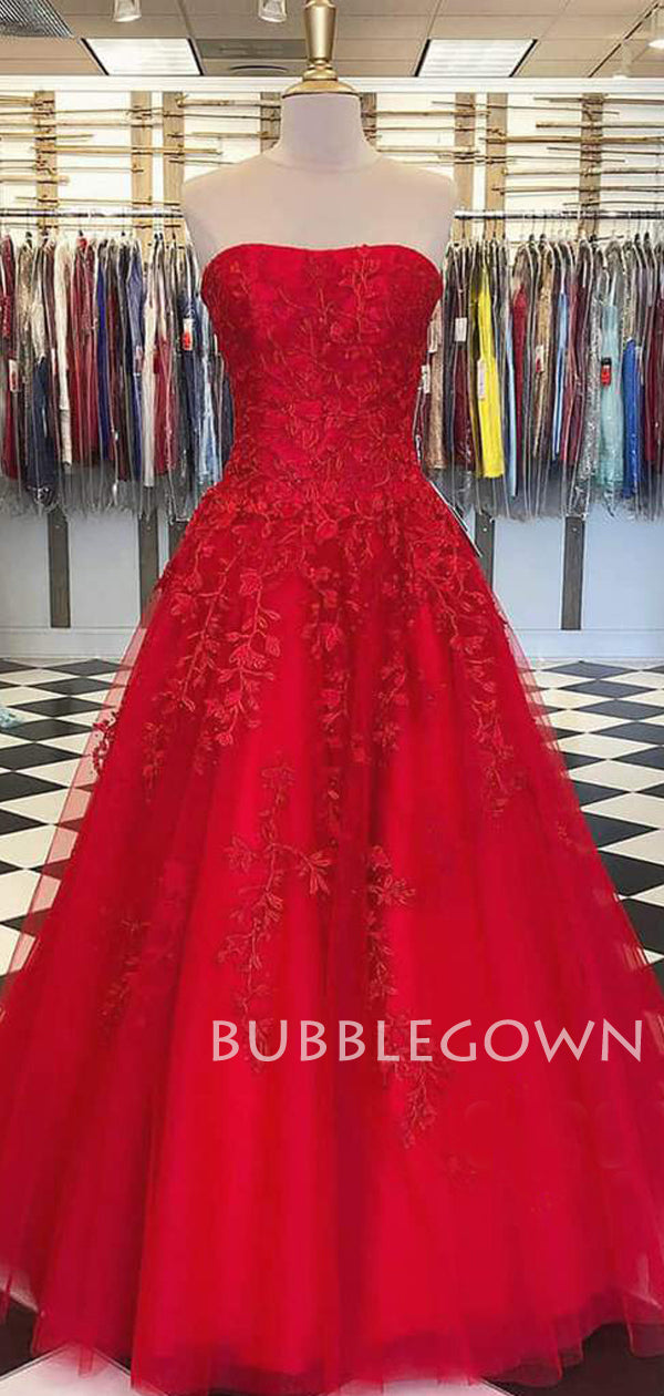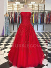 Red Tulle A-line Appliques Lace Long Evening Prom Dresses, Cheap Custom Prom Dress, MR7632