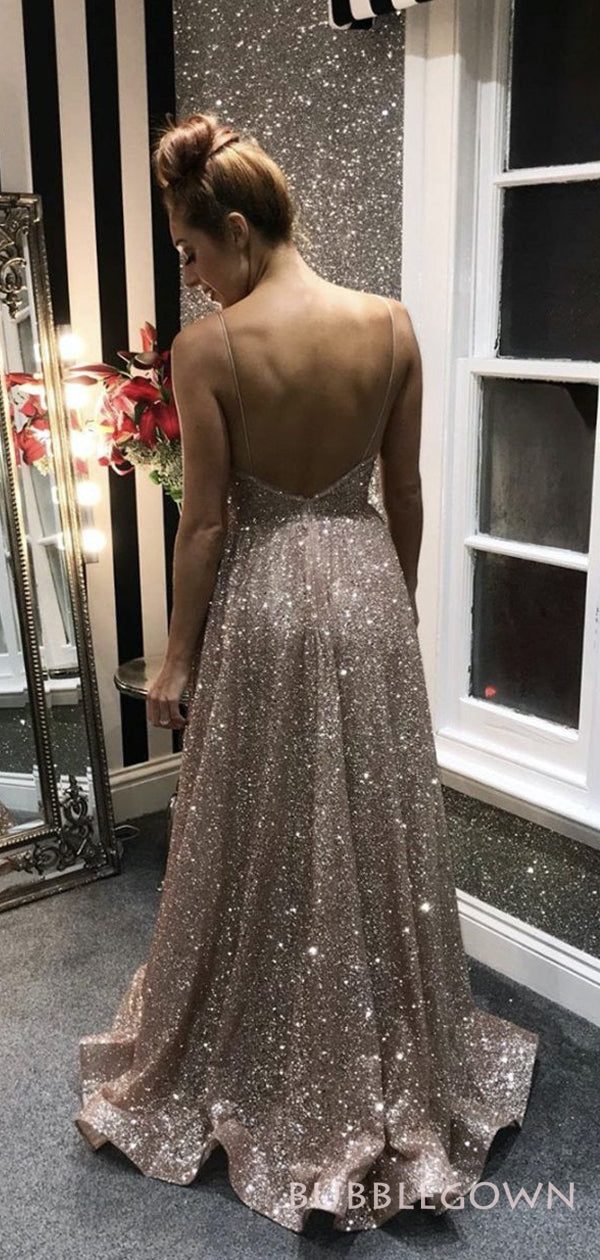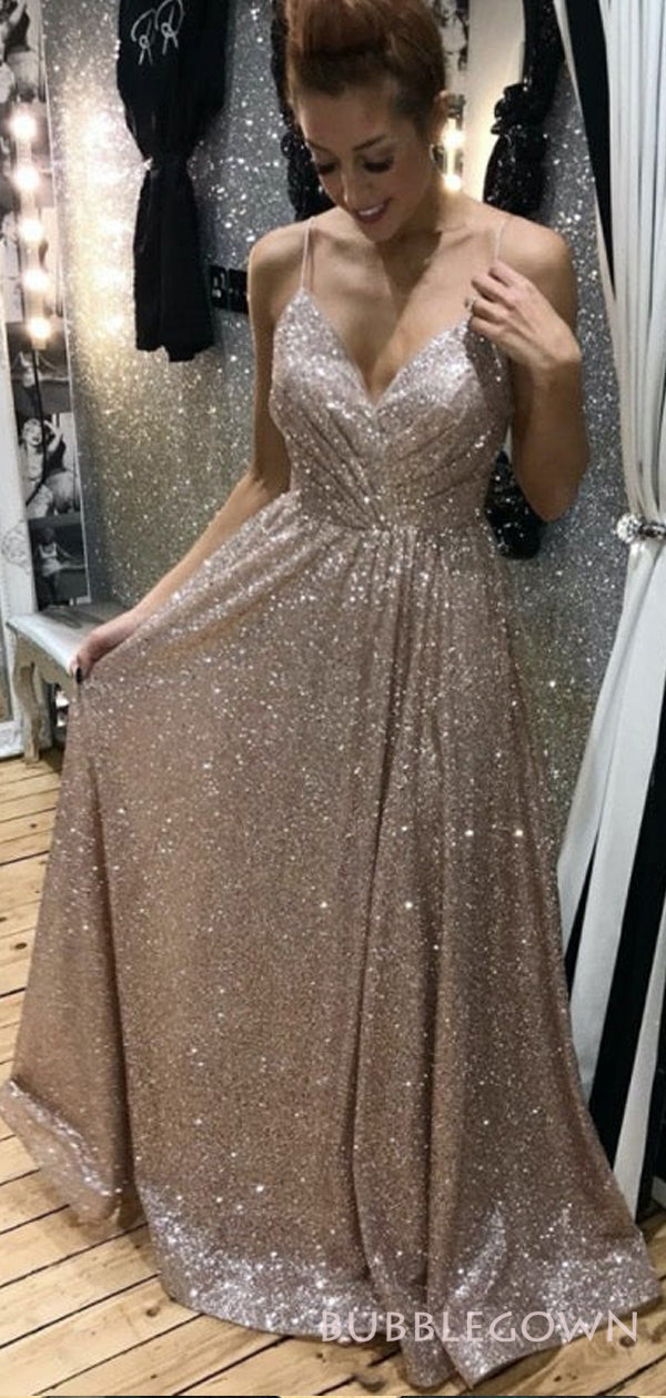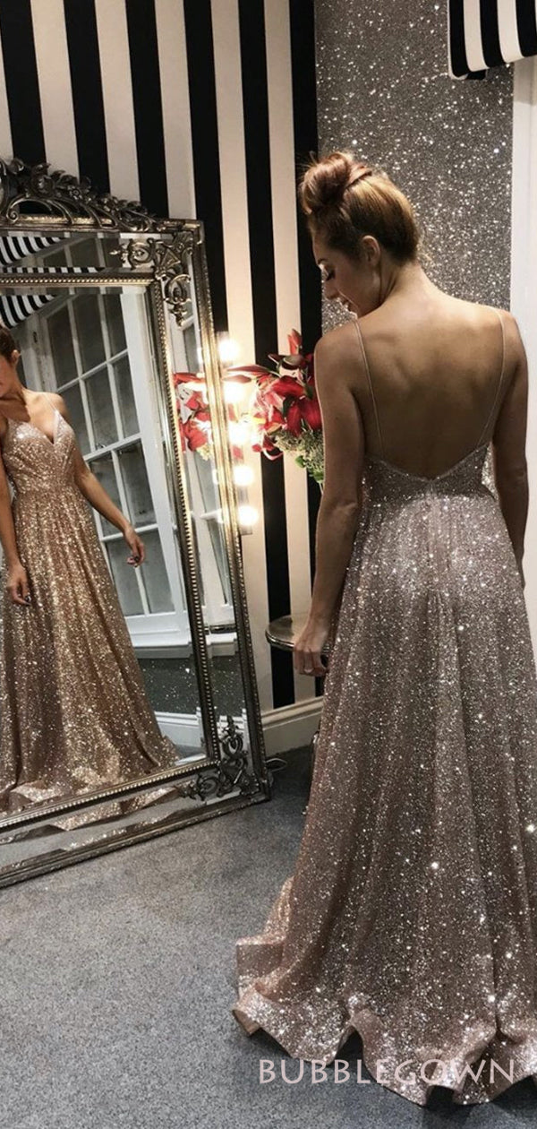 Spaghetti Atraps Gold Sequin Sparkly Long Evening Prom Dresses, A-line Backless Custom Prom Dress, MR8250