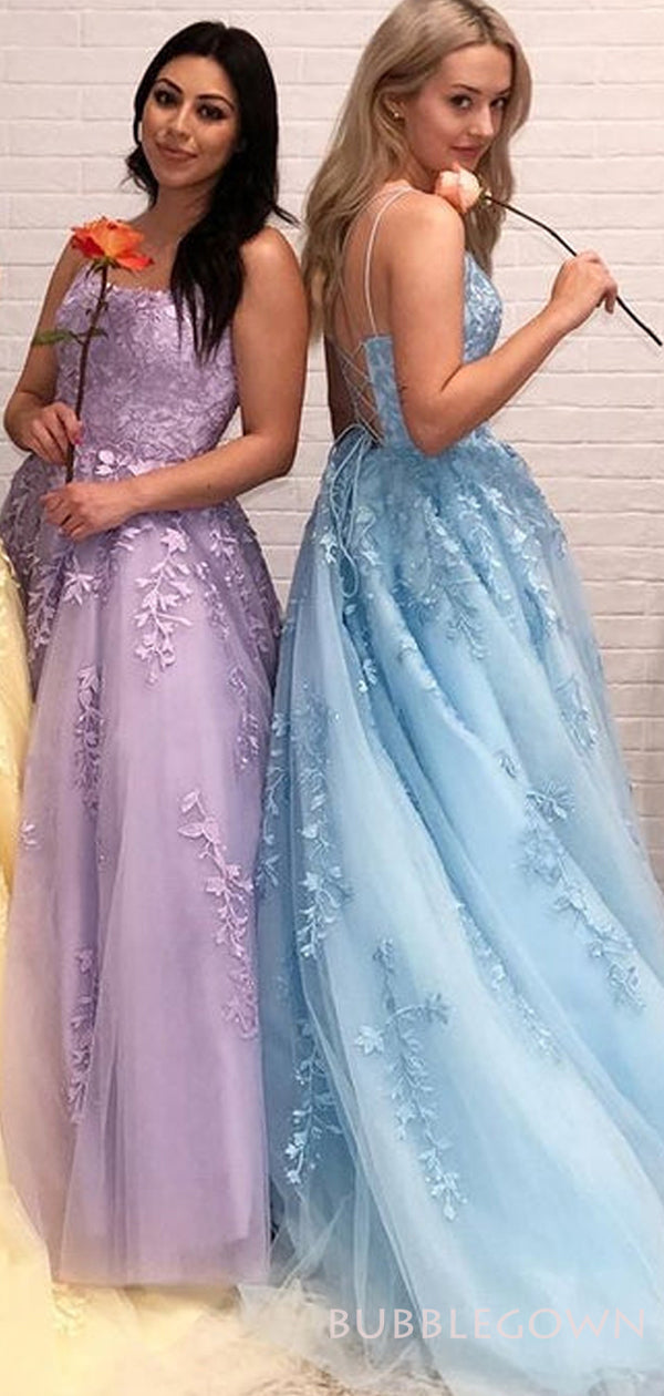 Spaghetti Straps Tulle Appliques Long Evening Prom Dresses, A-line Custom Prom Dress, MR8286
