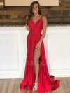 V Neck side Slit A-line Red stretch satin Spaghetti Straps Long Evening Prom Dresses, Cheap Custom Prom Dresses, MR7537