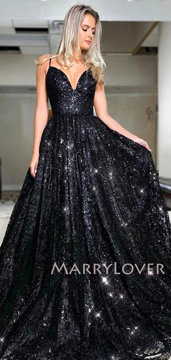 V Neck Sparkle Black Long Evening Prom Dresses, Cheap Custom Sweet Prom dresses, MR7101