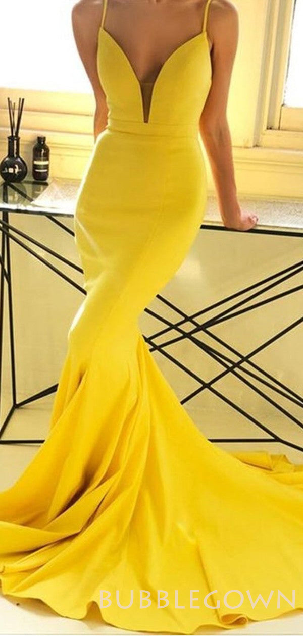 Yellow Satin Mermaid Spaghetti Straps Long Evening Prom Dresses, Cheap Custom Prom Dress, MR7901