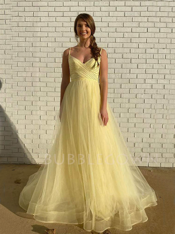 Yellow Tulle V Neck A-line Long Spaghetti Straps Long Evening Prom Dresses, Cheap Custom V Back Prom Dress, MR7550