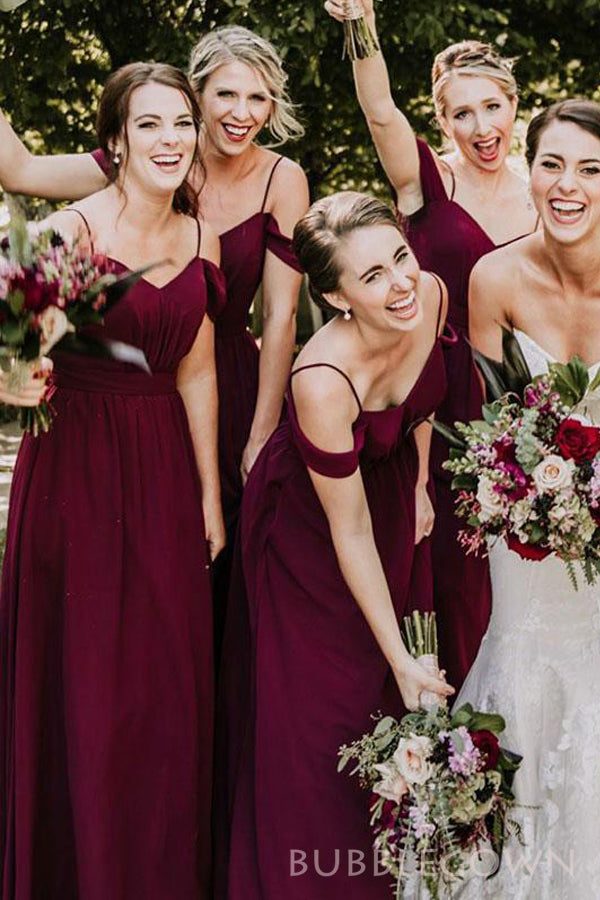 Off Shoulder Burgundy Chiffon A-line Cheap Long Custom Bridesmaid Dresses , BGB0034