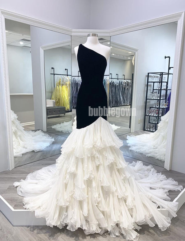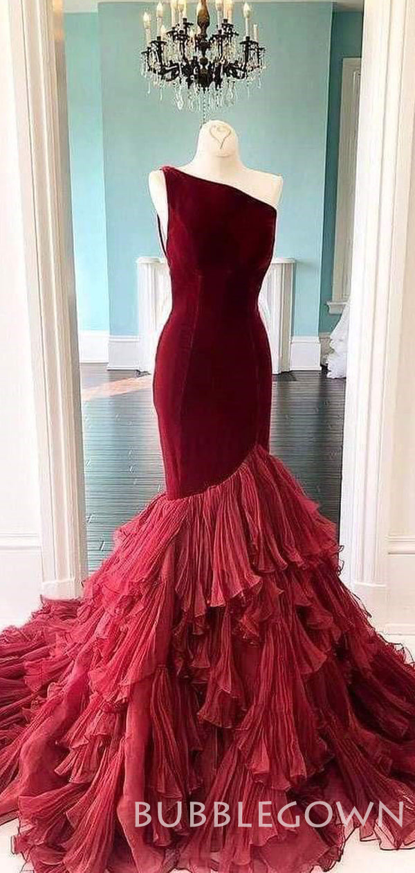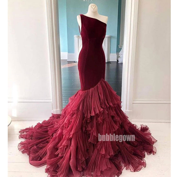 One Shoulder Mermaid Tulle Velvet Long Prom Dresses GDW111