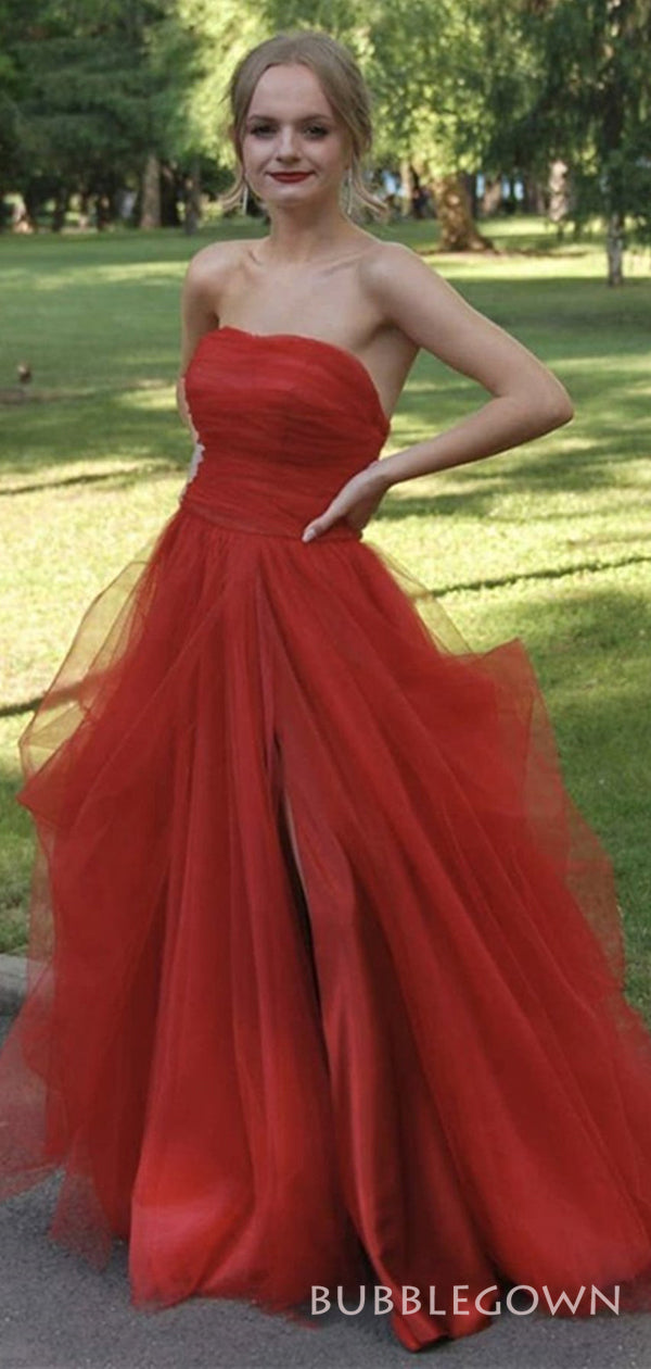 Red Tulle Strapless A-line Long Evening Prom Dresses, Custom Side Slit Prom Dresses, BGS0038