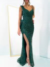 Mermaid Dark Green Sequins Long Evening Prom Dresses, Custom Side Slit Prom Dress, BGS0079