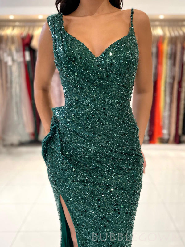Mermaid Dark Green Sequins Long Evening Prom Dresses, Custom Side Slit Prom Dress, BGS0079 Mermaid Dark Green Sequins Long Evening Prom Dresses, Custom Side Slit Prom Dress, BGS0079
