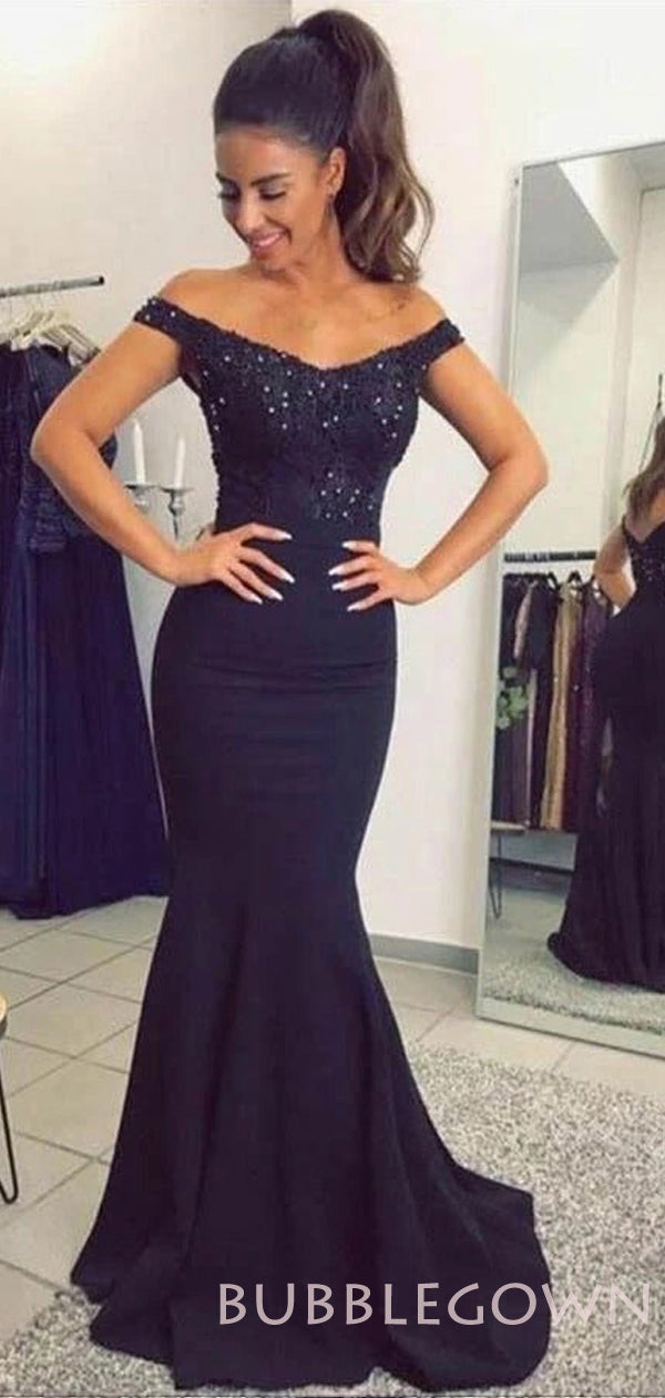 Off Shoulder Navy Blue Satin Appliques Long Beaded Mermaid Evening Prom Dresses, Cheap Custom Prom Dresses, MR7927 Off Shoulder Navy Blue Satin Appliques Long Beaded Mermaid Evening Prom Dresses, Cheap Custom Prom Dresses, MR7927
