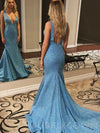Sexy Deep V-neck Dusty Blue Sparkly Long Mermaid Evening Prom Dresses,