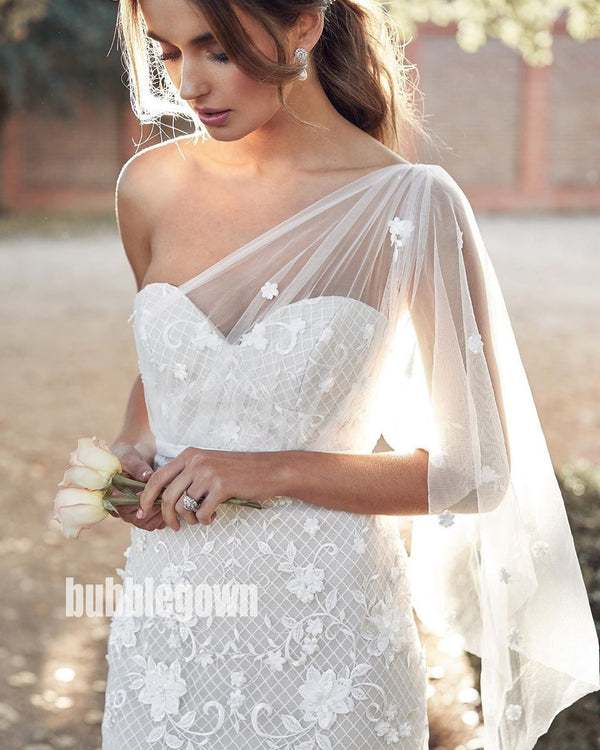 Unique White One-shoulder Mermaid Lace Long Wedding Dresses, BGH029