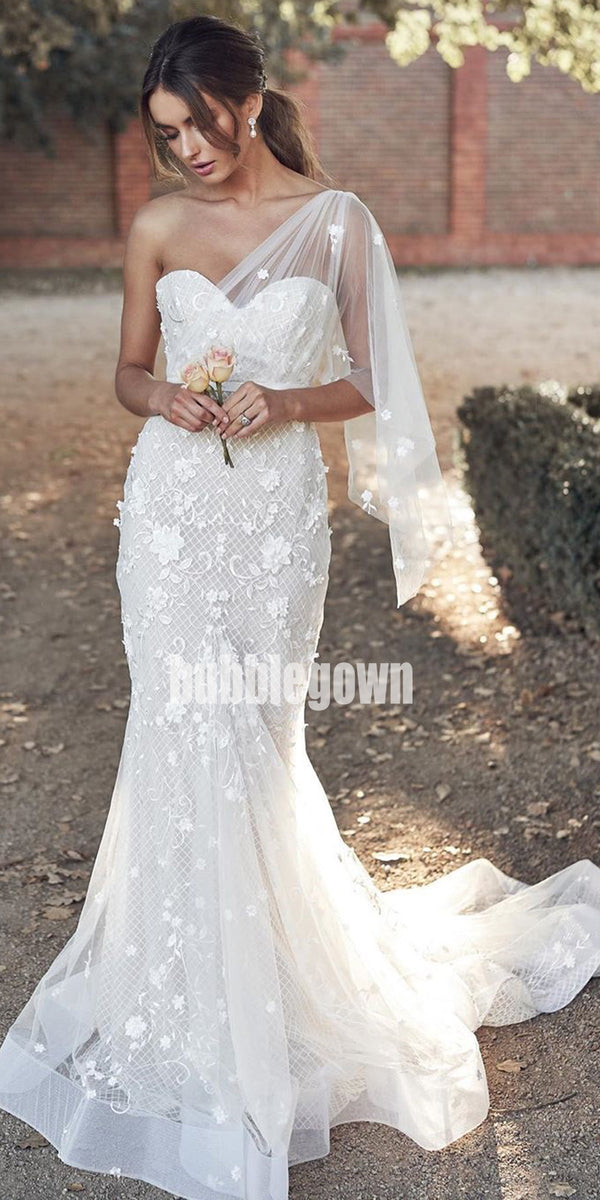 Unique White One-shoulder Mermaid Lace Long Wedding Dresses, BGH029 Unique White One-shoulder Mermaid Lace Long Wedding Dresses, BGH029