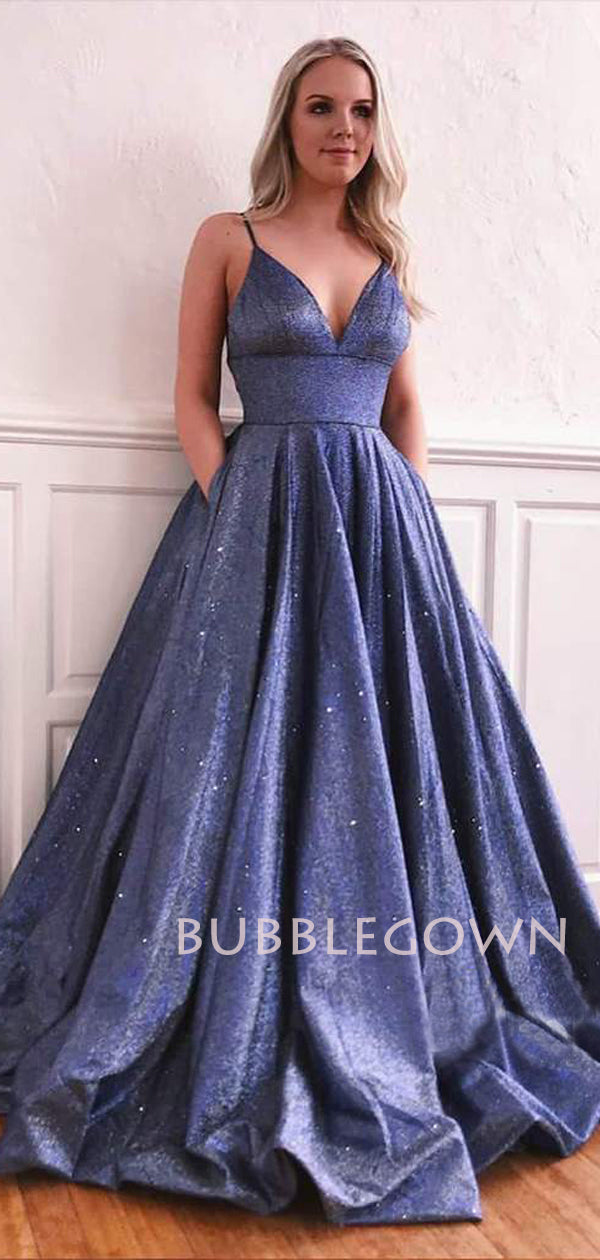 Deep V Neck A-Line Sparkly Backless Long Evening Prom Dresses, Cheap C