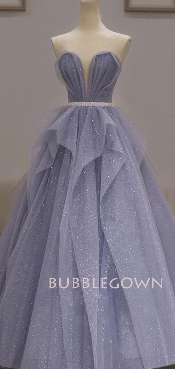 Deep V Neck Tulle A-line Long Evening Prom Dresses, Cheap Custom Prom