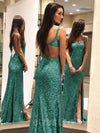 Green Sequin Spaghetti Straps Long Mermaid Evening Prom Dresses, Cheap