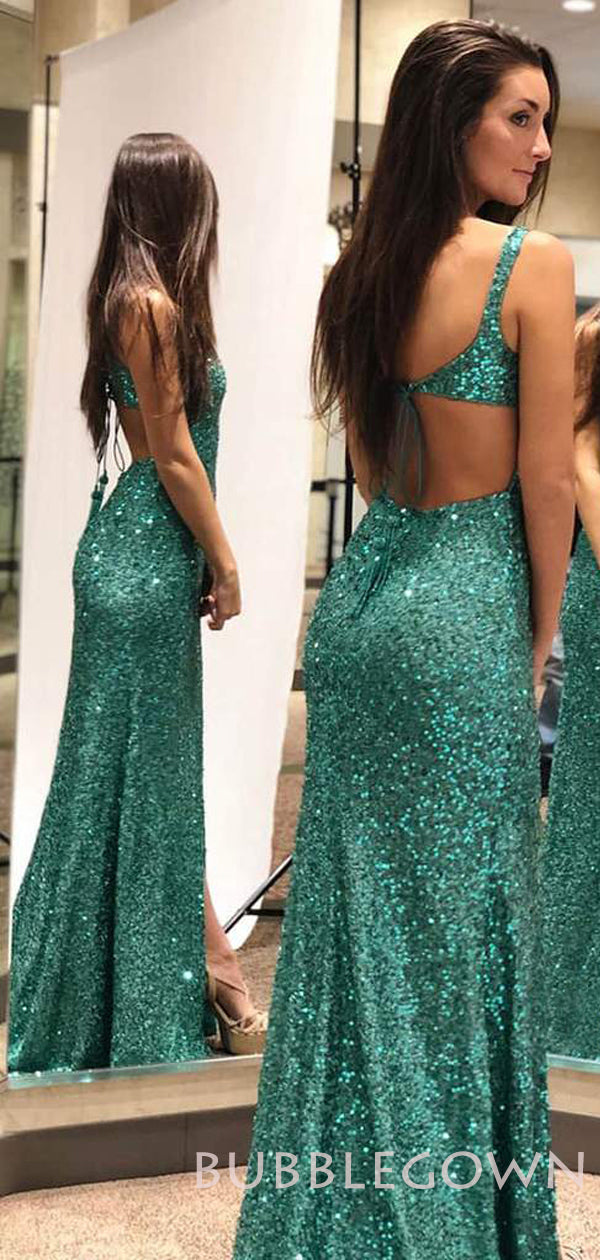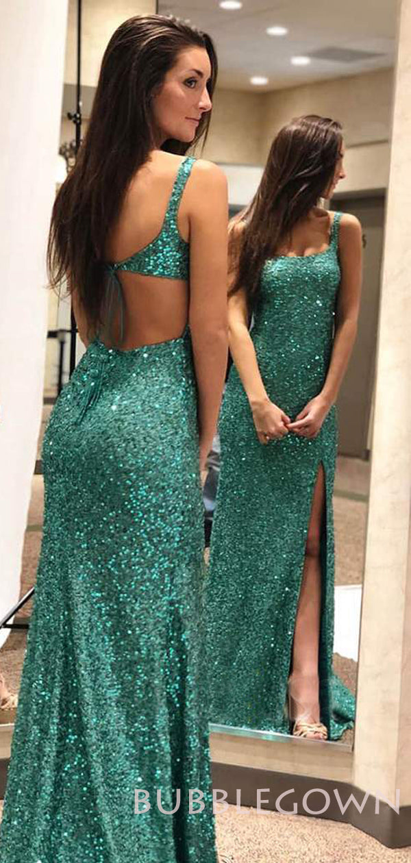 Green Sequin Spaghetti Straps  Long Mermaid Evening Prom Dresses, Cheap Custom Prom Dresses, MR7789