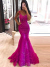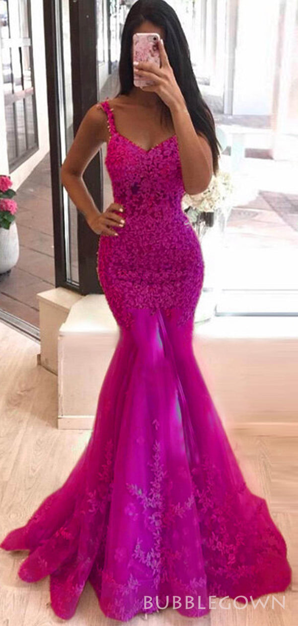 Mermaid Fuchsia Tulle Appliques Spaghetti Straps Long lace Evening Prom Dresses, MR8122