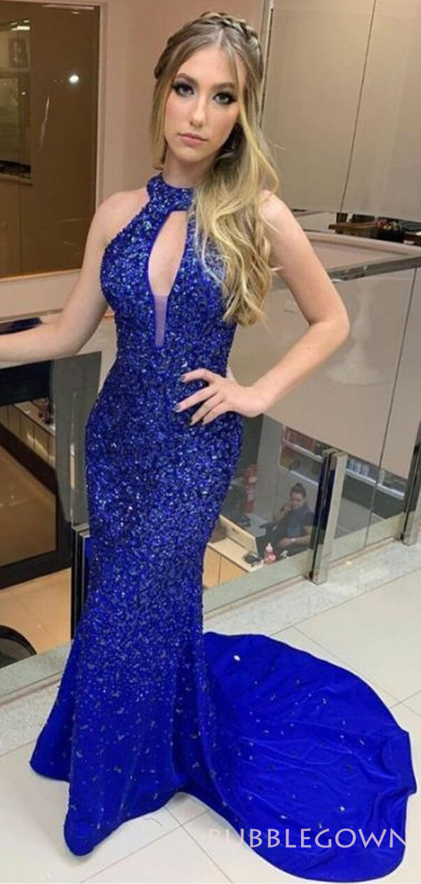 Mermaid Royal Blue Satin Beaded Long Evening Prom Dresses, Halter Custom Prom Dresses, MR8279