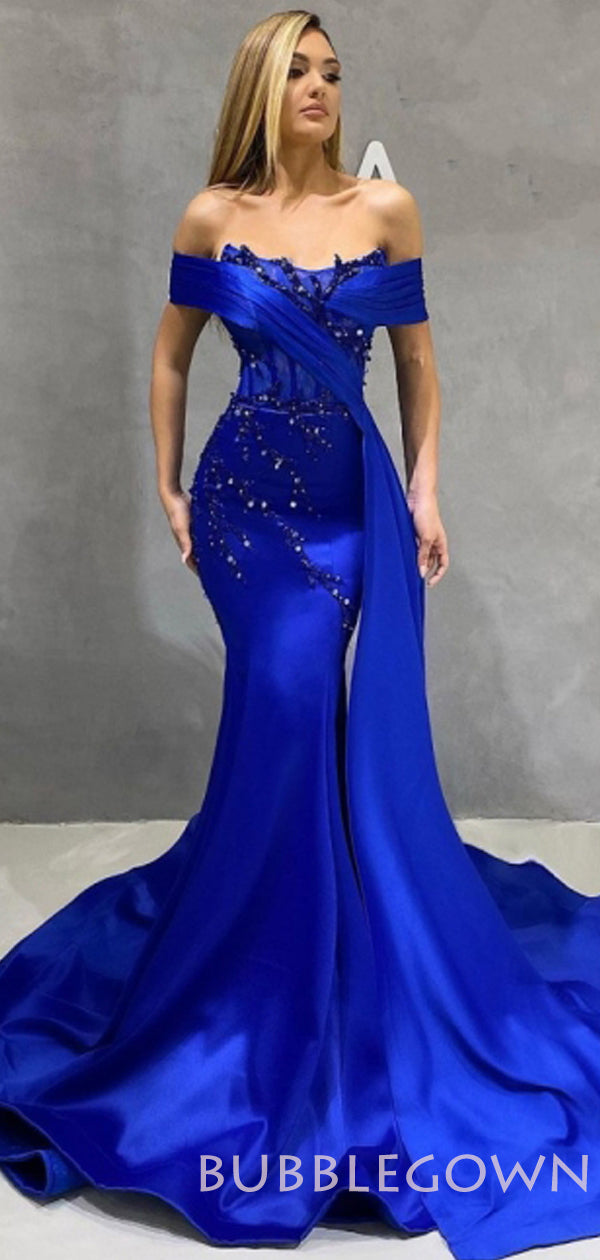 Off Shoulder Blue Satin Mermaid Beaded Long Evening Prom Dresses, Cheap Custom prom dresses, MR7716 Off Shoulder Blue Satin Mermaid Beaded Long Evening Prom Dresses, Cheap Custom prom dresses, MR7716