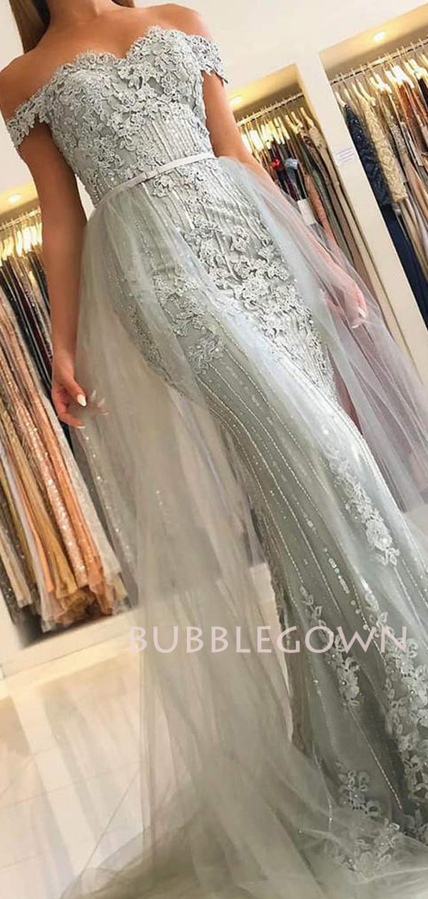 Off Shoulder Grey Lace Mermaid Beaded Long Evening Prom Dresses, MR7445