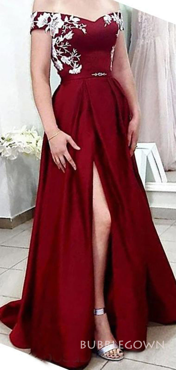Red Satin Appliques A-line Long Evening Prom Dresses, Custom Off Shoulder Prom Dresses, BGS0267