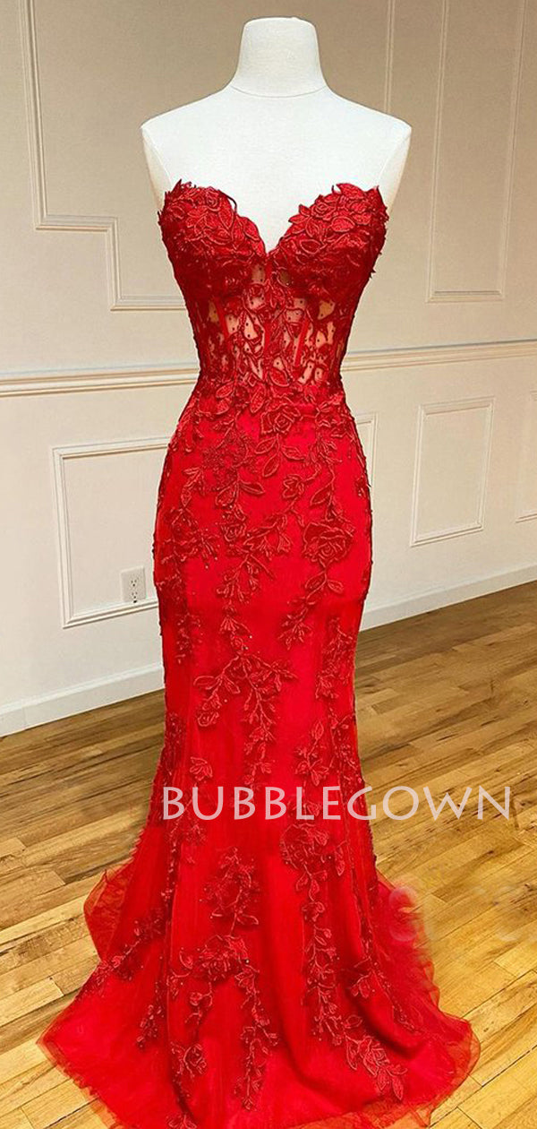 See Throuth Red Appliques Mermaid Lace Long Strapless Evening Prom Dresses, MR7451 See Throuth Red Appliques Mermaid Lace Long Strapless Evening Prom Dresses, MR7451