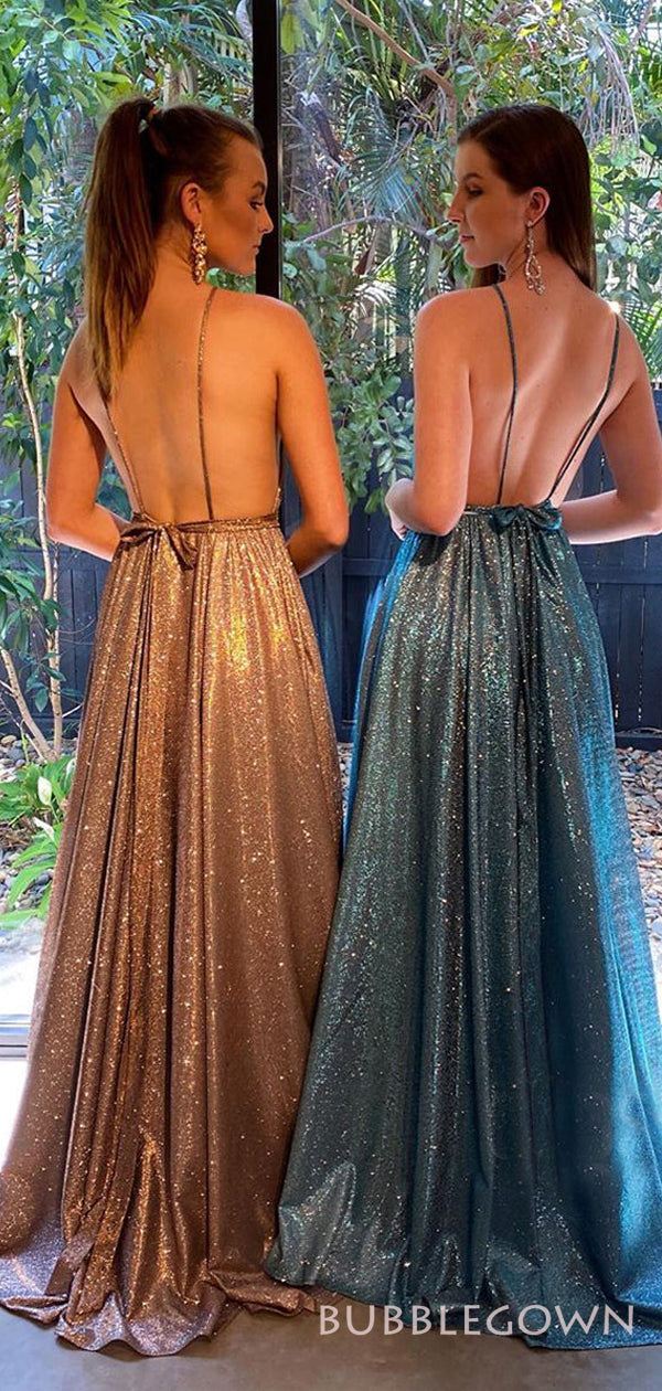 Sexy Backless Spaghetti Straps Sparkly Long Evening Prom Dresses, Deep V Neck A-line Custom Prom Dresses, MR8254