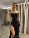 Simple Mermaid Black Satin Strapless Long Evening Prom Dresses, Custom Side Slit Prom Dress, BGS0146